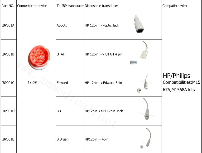 IBP001A :Hp Compatible -Appott IBP Cable adaptador, 10 pies, Hp12pin >>6p6c Jack IBP001B :Hp Compatible -UTAH IBP Cable adaptador, HP 12pin >> UTAH 4 pines IBP001C :Cable adaptador HP Compatible-Edward IBP, HP 12pin ->Edward-5pin IBP001D :Hp Compatible -BD IBP Cable adaptador, Hp12pin >>bD-7pin Jack IBP001E :Hp Compatible -Cable adaptador B.Bruan IBP, Hp12pin > 4 pines Compatibilidades : M1567A, kits M1568A