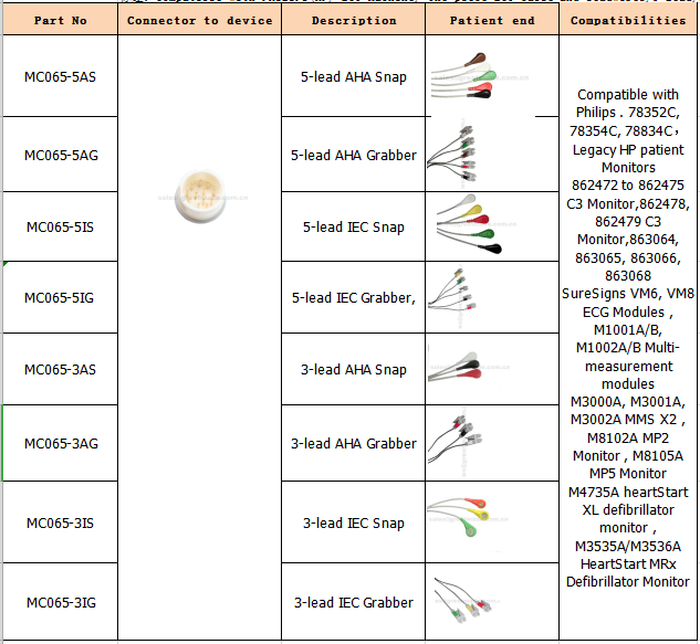 "Compatible con Philips. 78352C, 78354C, 78834C, Monitores de pacientes HP heredados 862472 a 862475 Monitor C3, 862478, 862479 Monitor C3, 863064, 863065, 863066, 863068 SureSigns VM6, VM8 Módulos de ECG, M1001A / B, M1002A / B Multi- módulos de medición M3000A, M3001A, M3002A MMS X2, M8102A Monitor MP2, M8105A Monitor MP5 M4735A monitor desfibrilador heartStart XL, M3535A / M3536A Monitor desfibrilador HeartStart MRx "